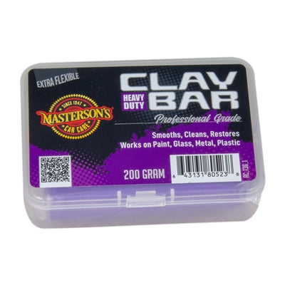 The Masterson’s Car Care Heavy Purple 200 Gram Clay Bar with Case restores a smooth-as-glass feel to any vehicle. Easily removes overspray, contamination, brake dust, rail dust, road tar, and much more! You name it, if it falls on your vehicle, Masterson’s Heavy Purple 200g Clay Bar will remove it. It’s easy to use! All you do is spray Masterson’s Detail Spray or Masterson's Slick Clay Lube, rub the clay side to side, and wipe it off. Enjoy gloss and shine by removing all contamination, without harming your paint. Masterson’s Heavy Purple 200 Gram Clay Bar is an essential tool for your detailing arsenal. Safe for all old and new vehicles. Works on all surfaces that are painted, shiny, or clear. Use it on your windshields, plastics, wheels, trim, mirrors, glass and more. Masterson’s Heavy Purple 200 Gram Clay Bar uses cutting edge technology and is designed to be used with Masterson’s Detail Spray or Slick Clay Lube. If you want the best shine, you need Masterson’s Heavy Purple 200 Gram Clay Bar. The Clay Bar comes in a massive 200-gram resealable container so you can use it on up to 50 cars. For ultimate shine and protection, follow-up with Masterson’s Original Carnauba Wax. The Heavy Purple Clay Bar is ideal for restoring gloss and shine to most painted surfaces by removing oxidation, mineral deposits, and contamination caused by pollutants including hard water spots. This high-quality detailing clay bar comes in a massive 200-Gram bar with a resealable container for storing and use on multiple vehicles. The Masterson’s Heavy Purple 200 Gram Clay Bar can be used on all vehicles including cars, trucks, motorcycles, RVs, as well as aircraft and marine. Masterson’s Heavy Purple 200 Gram Clay Bar is great for removing contaminants from paintwork, but also works on fiberglass, plastic, fairings, windscreens, wheels, exhausts, headlights, and much more. Easy to use, take a small piece of Masterson’s Heavy Purple 200 Gram Clay Bar and work it flat onto your hands. Simply lubricate the surface with Masterson’s Detail Spray and work the Medium Blue 200 Gram Clay Bar back and forth on the surface while applying minimal pressure. Masterson’s Heavy Purple 200 Gram Clay Bar is soft enough to conform around any surfaces and hard to reach areas. Clay bar is one of the most versatile and universal detailing tools ever! Synthetic detailing clay bar has a Heavy level cut suitable for the most demanding jobs and especially necessary for any vehicle old and new. Perfect for vehicles that are often parked outside. Innovative technology engineered into the clay bar is designed to bind surface contamination and soft enough to contour around the paint surface making the clay bar virtually frictionless. No swirls and no scratches means your car stays perfect! Restore shine and remove contamination with Masterson’s Heavy Purple 200 Gram Clay Bar!